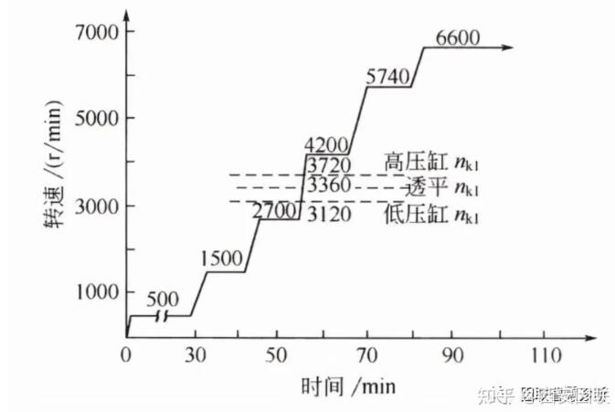 (如圖1所示的空氣壓縮機升速曲線)。在升速同時對機組運行情況進行全面檢查,一切正常才可繼續升速,直到調速器起作用的最低轉速(設計轉速的85%左右)。通過臨界轉速要適當迅速,嚴密注意機組的振動情況。