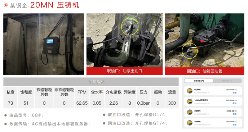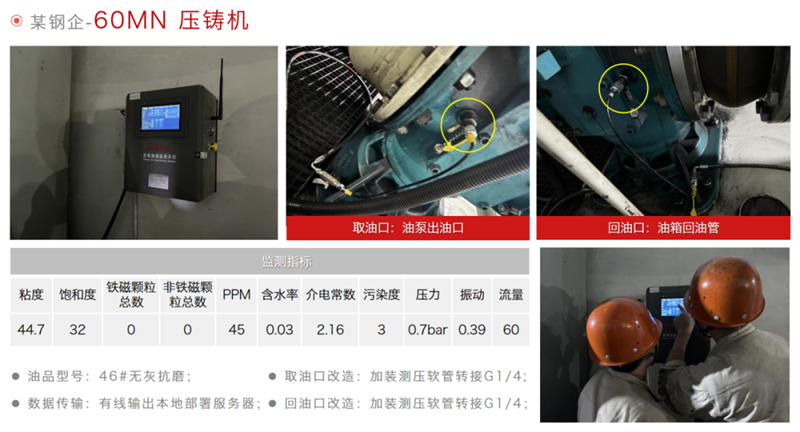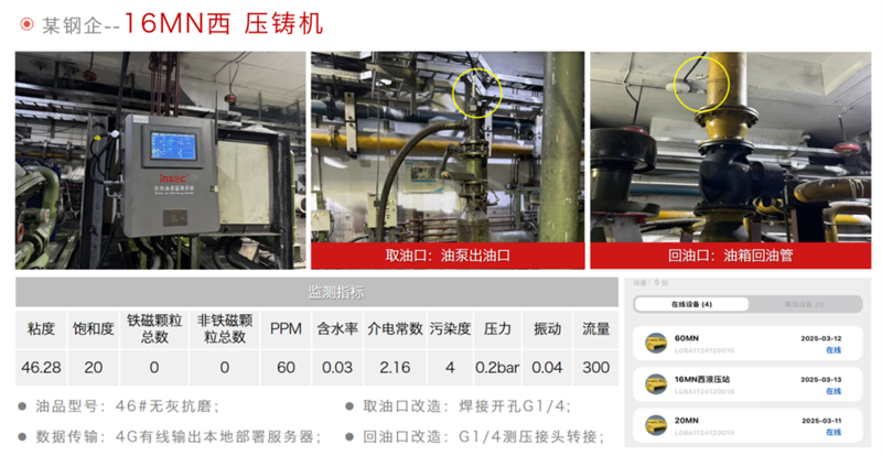 該冶鋼廠部署的5臺智能在線油液監測系統,為壓鑄機液壓系統故障預警、預測性維護提供關鍵支撐,切實提升壓鑄機運行穩定性,降低非計劃停機風險,成為工業設備智能化運維的典型示范。